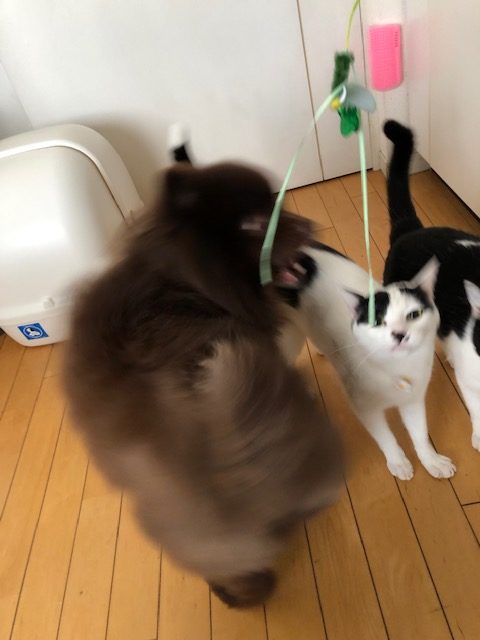 くまちゃんも2人の真似をして猫じゃらしで遊ぼうとするもなんか違う🤣🤣