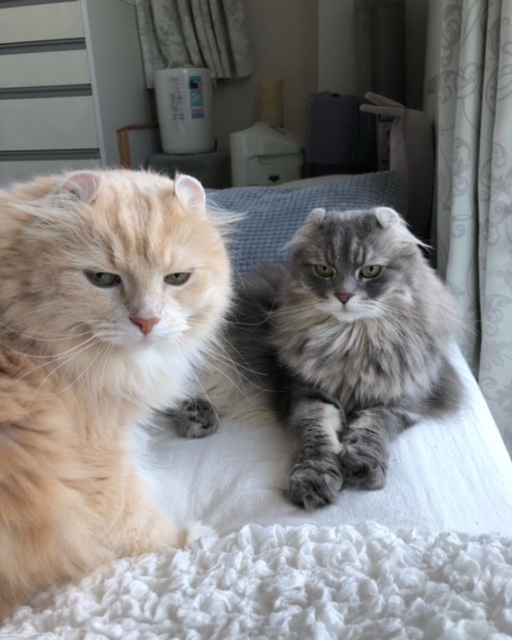 アメリカンカールとスコティッシュフォールドの良いとこ取りのふーたちゃんとちはやちゃん。